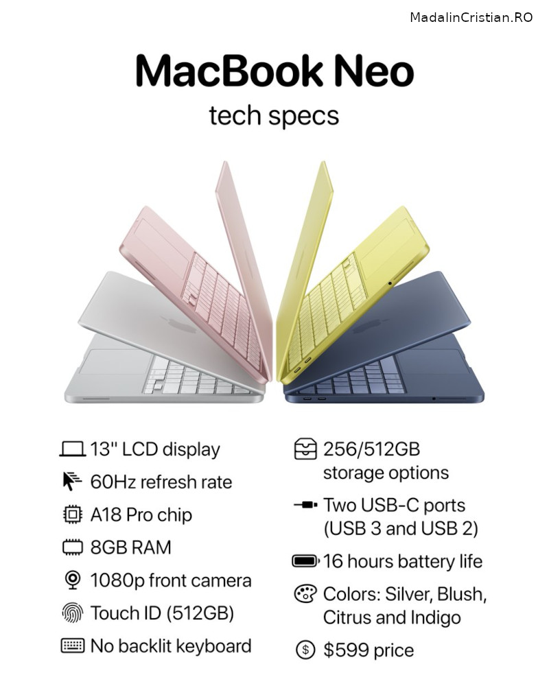 Noul MacBook Neo este acum disponibil pentru precomenzi, urmând să intre pe piaţă pe 11 martie.