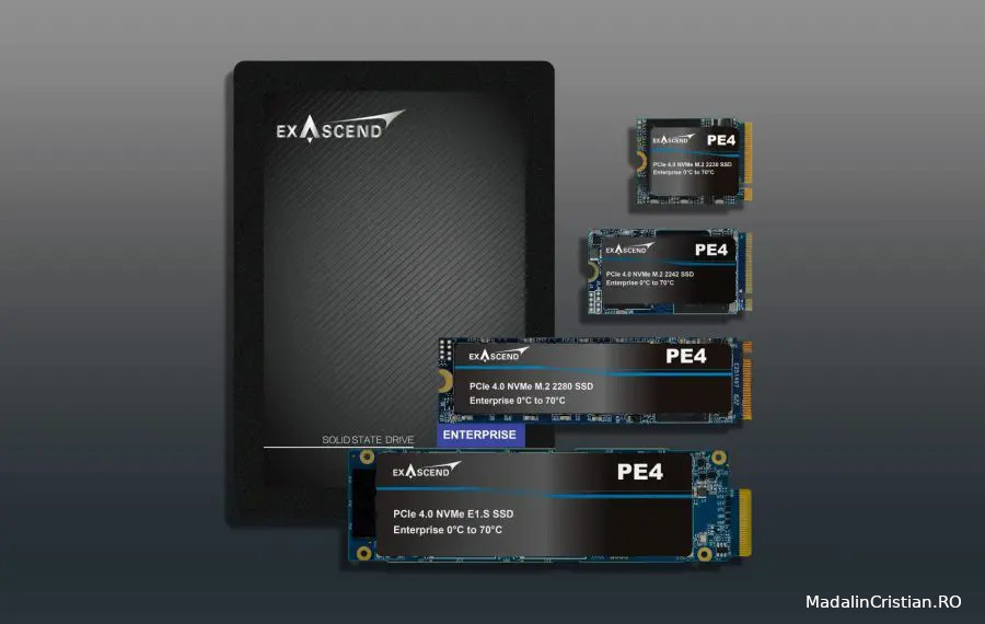Exascend Enterprise-Grade PE4 PCIe Gen4 NVMe M.2 SSD este gândit pentru mediul enterprise, are viteze limitate la 3270 MB/s la citire şi 2980 MB/s la scriere, are un consum activ de energie de sub 7.2W şi are un MTBF (adică un timp mediu de funcţionare estimat între două defecţiuni consecutive) de peste 2 milioane de ore (într-o traducere liberă, este foarte fiabil).